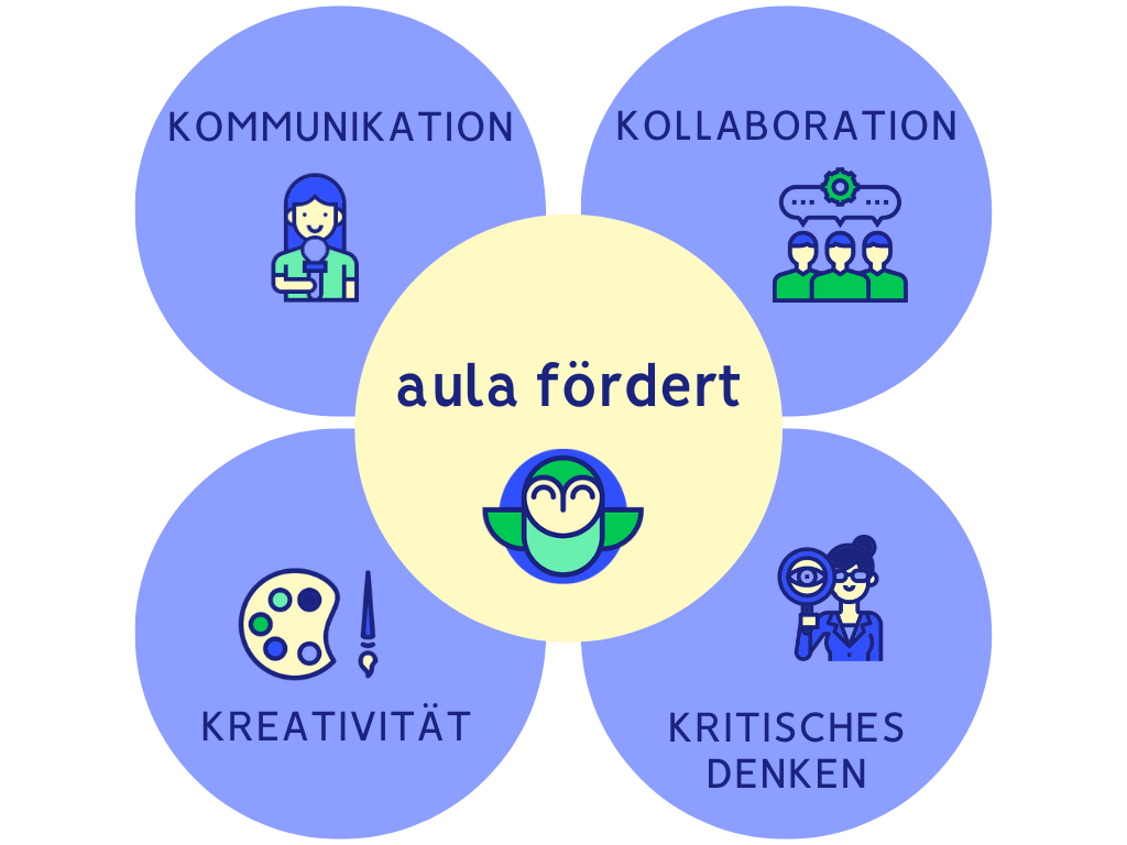 Mit aula kann das 4-K-Modell in der Schule verankert, und Schüler*innen besser auf ein Berufsleben im 21. Jahrhundert vorbereitet werden.